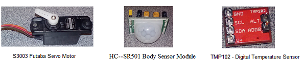 This project demonstrates temperature sensor (TMP 102) interface with the EagleSoC board via Inter-Integrated Circuit (I2C) protocol. The HC-SR501 Body Sensor module is used to detect the motion within the angle of 100 degrees and with maximum range of 7 meters. The temperature sensor triggers the Futaba servo motor via PWM signal once the threshold temperature of 26 C degrees is surpassed. These three project components are shown in Figure 1.