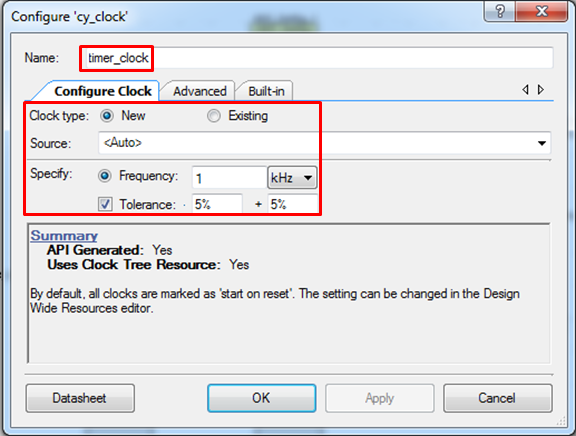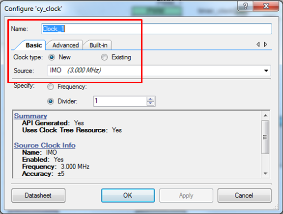 Select new clock type with Internal Main Oscillator (IMO) as a source and with frequency of 3.00 MHz.