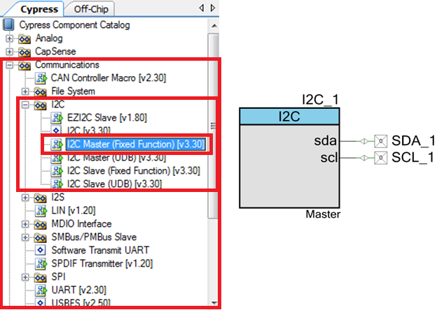 Find the I2C Master (Fixed Function) component in the catalog under "Communications" and "I2C" subdirectories.