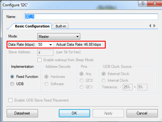 Double-click on the I2C block and select 50 kbps for its data rate. Press "OK".