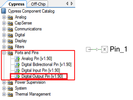 Return to the component catalog and find the Digital Output Pin under "Ports and Pins" directory. Drag and drop the component on the layout.