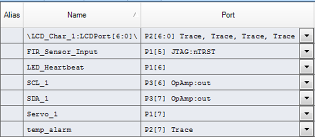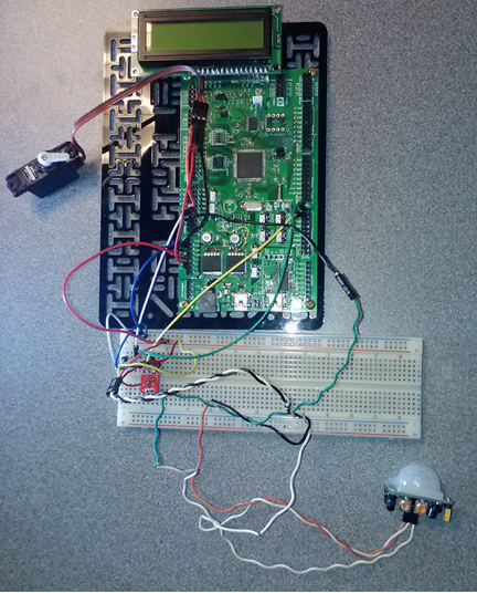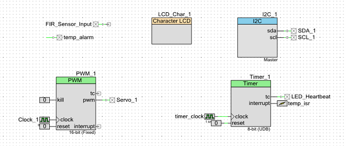 PSoC Creator allows drag and drop of hardware modules in the "Top Design" area. The interfacing components for each hardware block with required interconnections are shown in Figure 2. PWM block is controlled through the 3.0 MHz clock. The digital output pin (Servo_1) represents the servo motor which receives signal through the PWM block. Passive Infrared (PIR) motion sensor is the HC-SR501 sensor which is represented by the Digital Input Pin. The signal is based on the motion detection and can be set to either high or low value. The temperature sensor is shown in the I2C block. The threshold alarm is being triggered through the Interrupt Service Routine attached to the timer block. The timer block has its own input clock. As soon as the threshold is surpassed, the temp_alarm_LED Digital Output Pin is being triggered. LED Heartbeat pin attached to the timer. The LCD block is used for temperature information display and can be used for all other debugging necessary within the project.