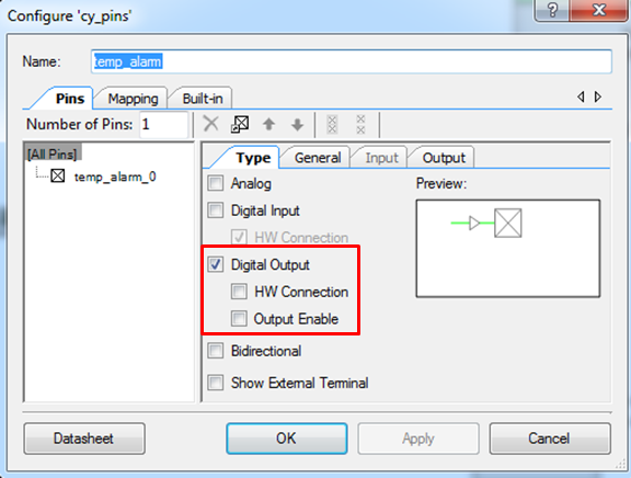 Leave one of the Digital Output Pins on layout and rename it to "temp_alarm" as shown on Figure 20.