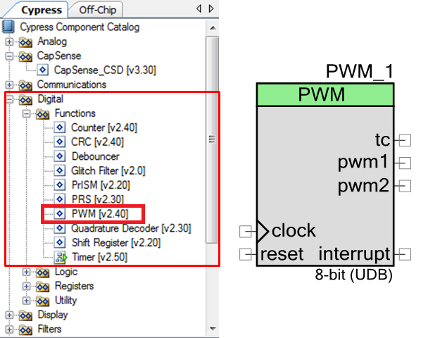 In order to add all the above components, start a new empty project from the PSoC Creator and save it under the directory of your choice. In the Workspace Explorer click on the Top Design branch and you will see the empty layout in the center of your screen. On the right side, you should find a Component Catalog. Search for the required components and drag-and-drop them to your layout in the center. Figure 3 demonstrates the search for PWM component under "Functions" directory. Transfer this component to your layout.